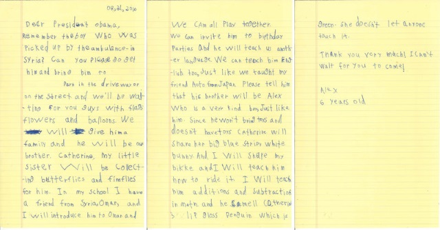 Segundo Claire, Alex enviou uma carta escrita de próprio punho à Casa Branca e endereçada ao presidente norte-americano. Nela, o garoto pede que Obama vá até a Síria (“por favor”) para buscar Omran e depois levá-lo até a sua casa — em Scarsdale, Nova York —, onde Alex estaria aguardando a todos com flores, bexigas e bandeiras. <3
