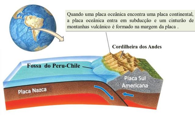 Figura mostra zona de subducção no encontro das placas Nazca e Sul-Americana – algo semelhante acontece abaixo de Bangladesh