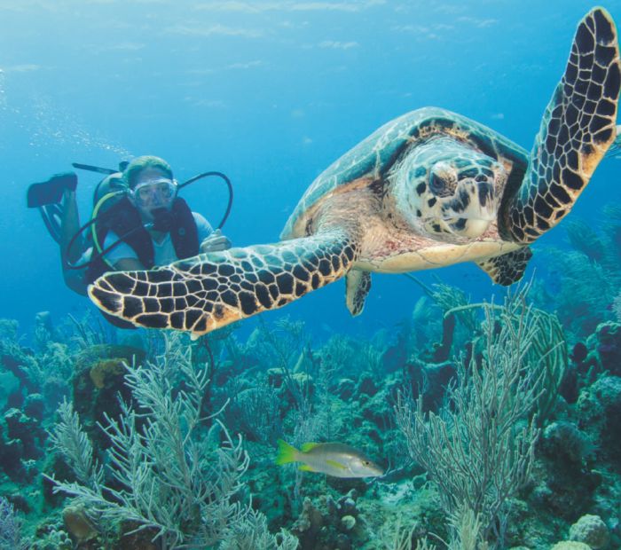 Os grandes recifes de corais, como o North Wall, ficam longe da costa, mas grande parte da região costeira conta com a proteção dos recifes. Esse ambiente protegido é não apenas um excelente local para nadar e praticar snorkel, mas também uma zona importante para a criação de peixes e outras espécies marinhas. Só em Grand Cayman, existem aproximadamente 240 pontos de mergulho, muitos deles a menos de 1 quilômetro da costa.